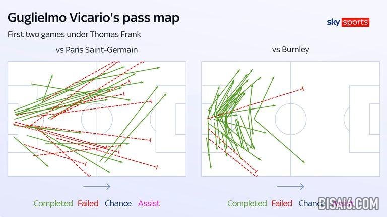 古利埃尔莫·维卡里奥(Guglielmo Vicario)的去世表明,在周六的3-0胜利中最清楚地表明。马刺守门员将球导向长时间对阵PSG后,将焦点切换为对阵伯恩利的球保留,仅在中途线上只试图两踢。
