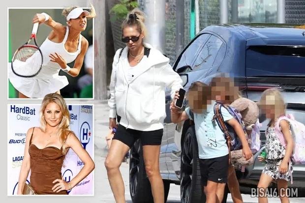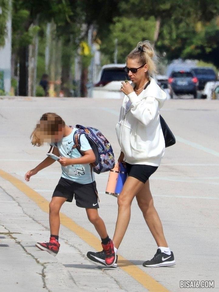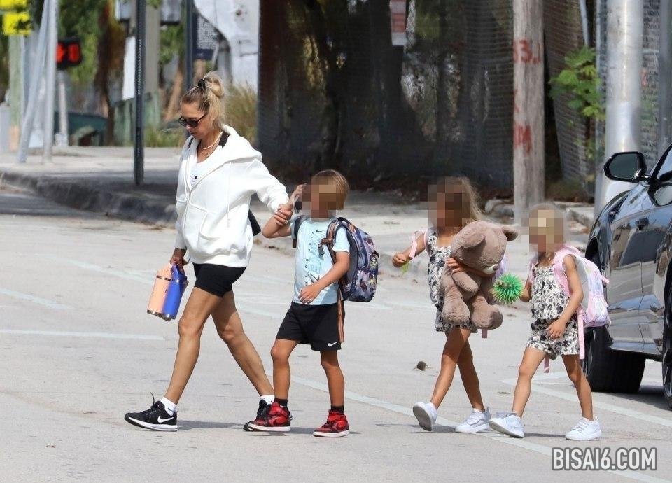 库尔尼科娃(Kournikova)与孩子们(7岁的双胞胎尼古拉斯(Nicholas)和露西(Lucy))和5岁的玛丽(Mary)一起走着时,穿着轻松的衣服换了舒适的衣服。