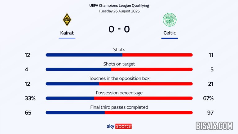 凯拉特(Kairat)是一支完全欧洲默默无闻的团队,直到现在,凯尔特人(Celtic)在当晚的目标上做出了更多的努力。对于他们缺乏质量的一切,他们都充满了内心和精神。他们赢得了更多的铲球,进行了更多的拦截并完成了更多的许可。他们赢得了决赛75-63。