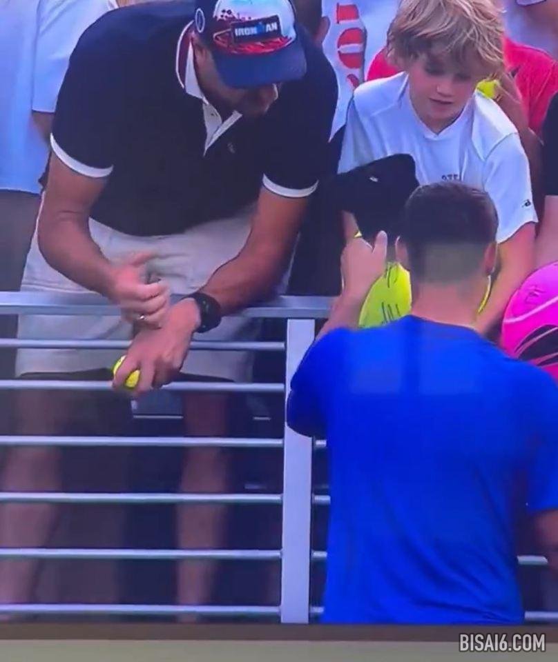 在法拉盛草地11号法庭上的庆祝活动中,他为新支持者签署了网球。