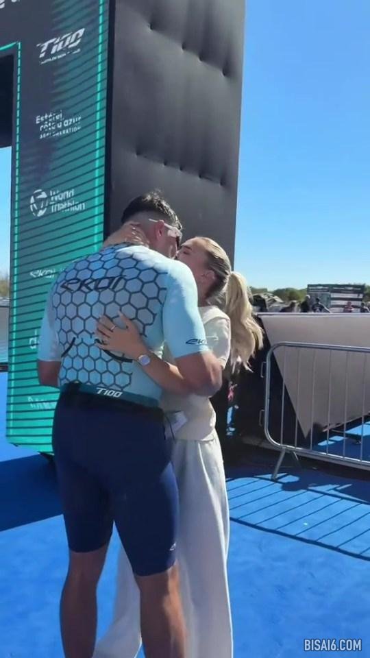 汤米·弗里(Tommy Fury)在完成了一个艰苦的世界冠军级铁人三项赛后,对女友莫莉·麦·海格(Molly-Mae Hague)亲吻。