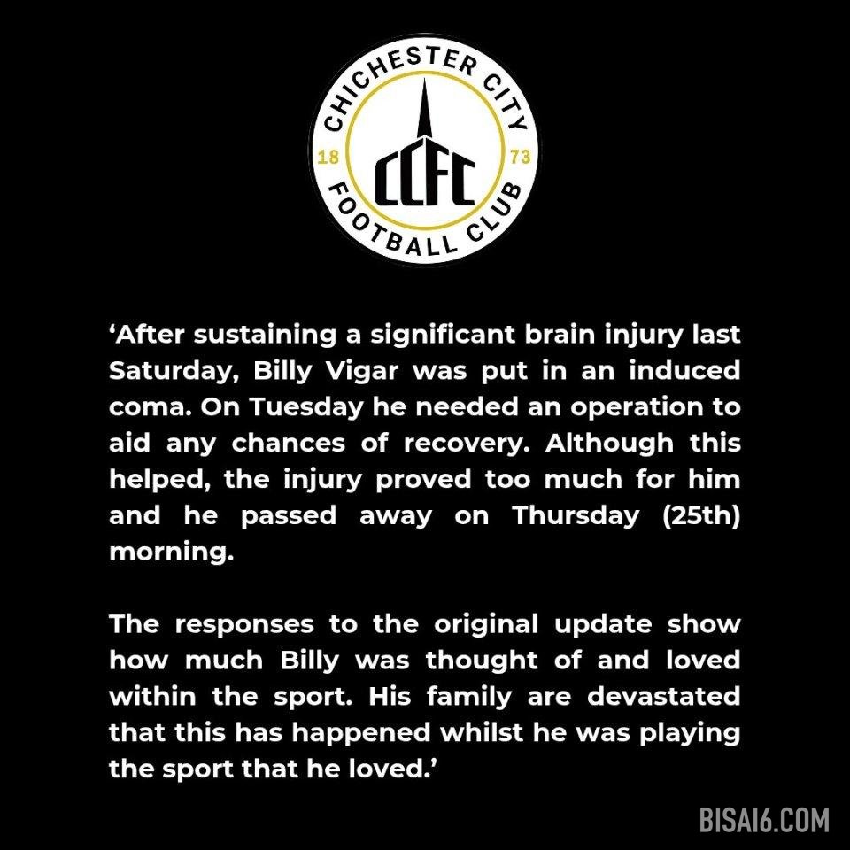周六与温盖特(Wingate)和芬奇利(Finchley)的比赛中,现年21岁的奇切斯特城(Chichester City)的比利·维加尔(Billy Vigar)被陷入昏迷状态。