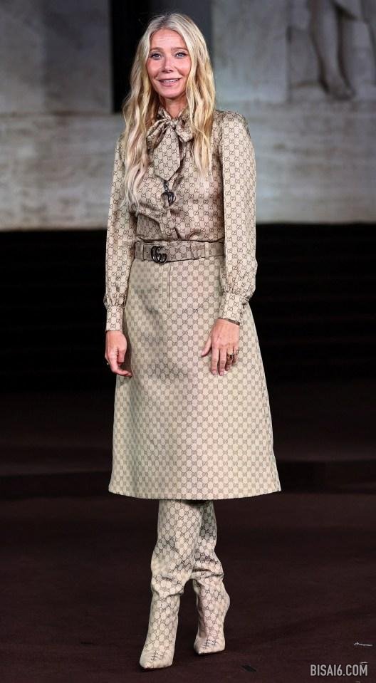 以本周的格温妮丝·帕特洛(Gwyneth Paltrow)的身份穿着会标的Gucci服装从头到脚。