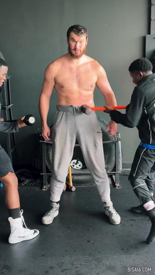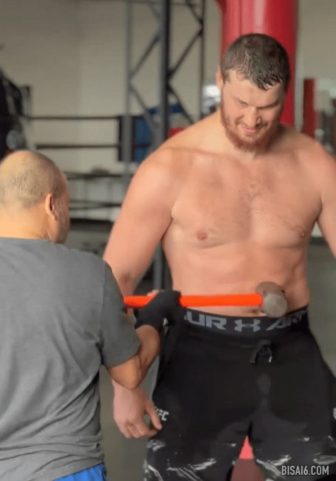 马赫穆多夫——前欧洲业余冠军——经常用大锤敲打他的腹肌来增强他的核心肌群。