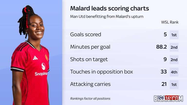 她的能力也是曼联开拓疆土的主要推动力。马拉德是该分区的头号得分手,也是领先的进攻载体(21 分,仅领先于曼城队的青叶藤野(20 分))。对于曼联追赶切尔西的希望来说,她的状态无疑至关重要——如果这确实有可能的话。