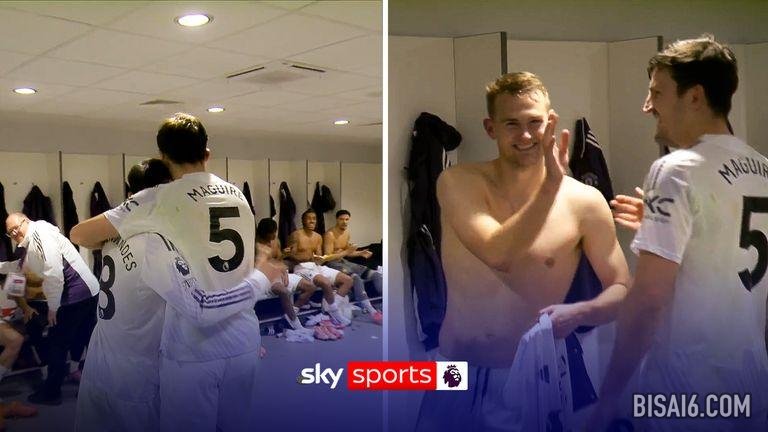 哈里·马奎尔在安菲尔德为曼联攻入制胜球后回到客场更衣室,引起了热烈的欢呼