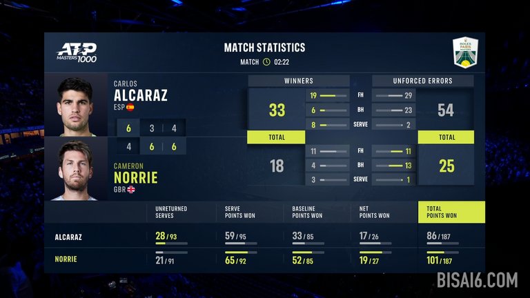 诺里获得了他一生中最大的一场胜利,打破了阿尔卡拉斯在大师赛中连续 17 场比赛获胜的记录