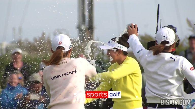 山下美梦有(Miyuu Yamashita)在 AIG 女子公开赛上庆祝她以两杆优势获胜时,周围都是日本选手。
