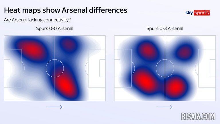 通过热图将上赛季 3-0 战胜热刺与今年的平局进行比较,他们选择的比赛区域之间存在明显的脱节。 12 个月前,阿森纳只用了不到 64 秒就取得了领先,表现更加平衡、冷静。最近的这次会议更加不平衡。断开连接在视觉上是清晰的。