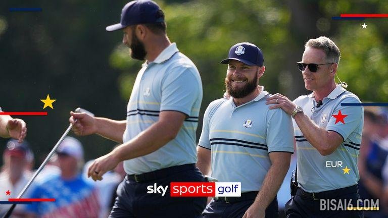 欧洲队的泰瑞尔·哈顿 (Tyrrell Hatton) 和乔恩·拉姆 (Jon Rahm) 以 4 比 3 的比分击败布莱森·德尚博 (Bryson DeChambeau) 和贾斯汀·托马斯 (Justin Thomas),获得欧洲队 2025 年莱德杯胜利的第一分