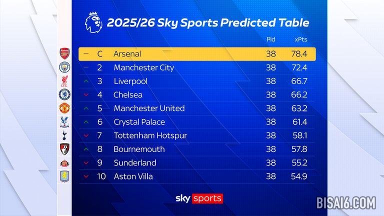 天空体育预测阿森纳榜首