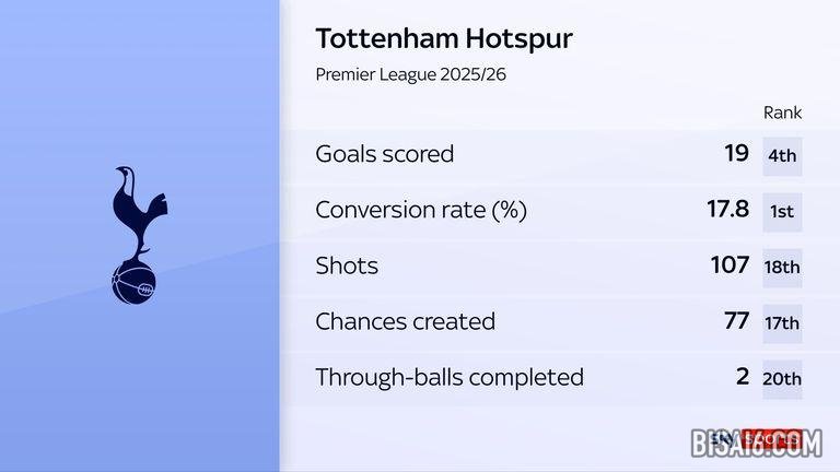 热刺的预期进球数比他们的预期进球数高出近八个——这是联盟中最大的超额表现。他们的直塞球尝试次数(4次)和完成次数(2次)也排名联盟垫底,而只有两支球队比热刺的射门次数和创造机会更少。