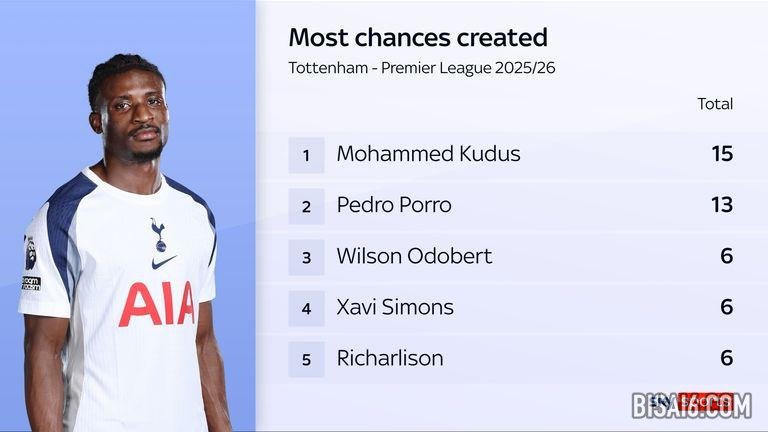 热刺的进攻严重偏向右路,库杜斯和右后卫佩德罗·波罗本赛季为热刺创造了最多的机会。