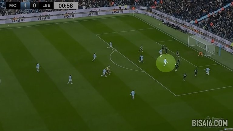 福登的效率依赖于他吸引绝望的防守者、暴露空间差距的能力。这是完美的诱饵。下图显示,哈兰德占据了足够的注意力,福登在无人看管的情况下鬼鬼祟祟地闯入禁区,并在 59 秒内得分。