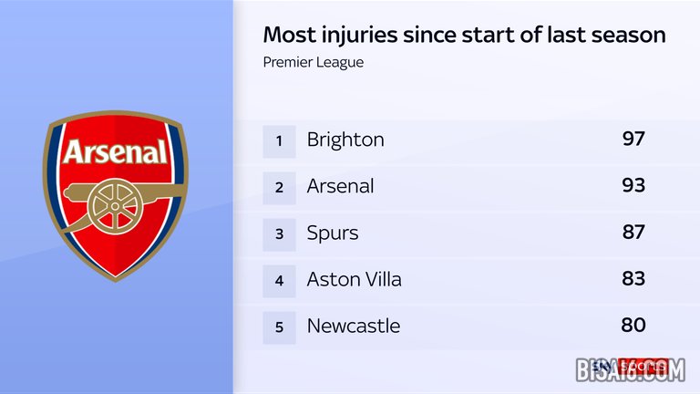 结合过去两个赛季,阿森纳和布莱顿一起是仅有的两支累计伤病人数超过 90 例的球队之一。