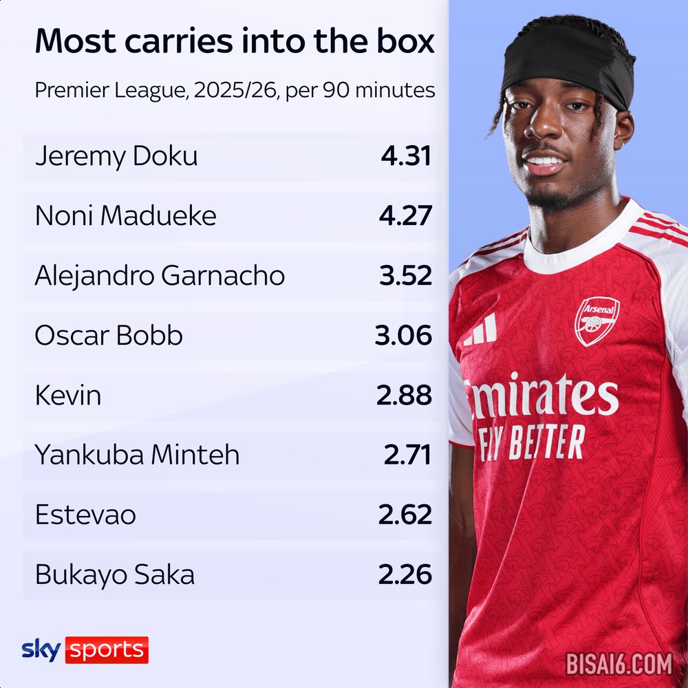 马杜克在对阵布鲁日的首场比赛中不需要走到对方禁区那么远。但这是他擅长的另一个领域。根据 GeniusIQ 的追踪数据,本赛季英超联赛中,只有曼城队的杰里米·多库(Jeremy Doku)每 90 分钟进入禁区的次数最多。