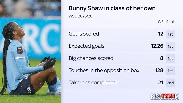 本文来源自:https://www.skysports.com/football/news/11095/13483674/how-manchester-city-striker-bunny-shaw-has-put-herself-in-the-conversation-of-womens-super-leagues-best-ever
