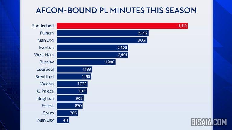 从参加非洲杯的球员上场时间来看,桑德兰再次成为受影响最严重的球队。
