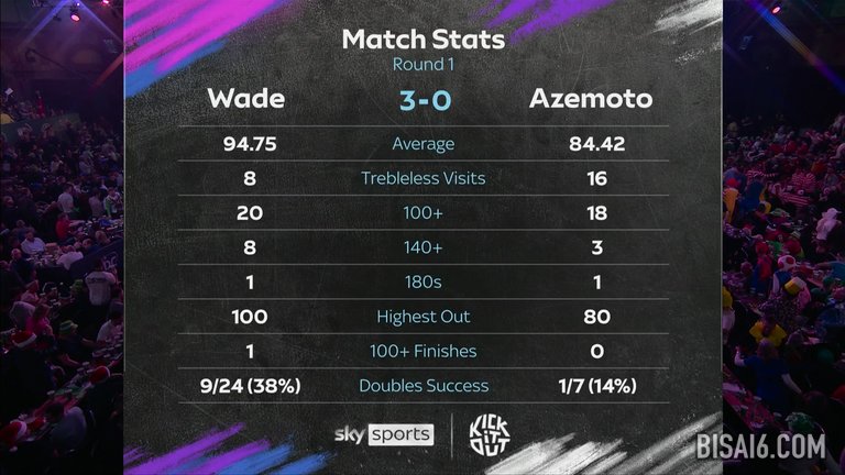 韦德今年两次进入大型电视决赛,在之前的三场世界飞镖锦标赛比赛中全部输掉,但他直落两盘击败日本选手阿泽本龙星,避免了再次提前出局。