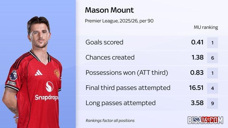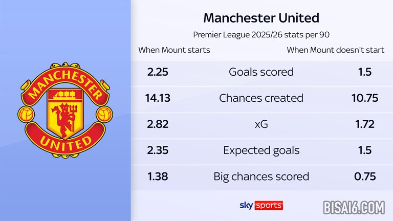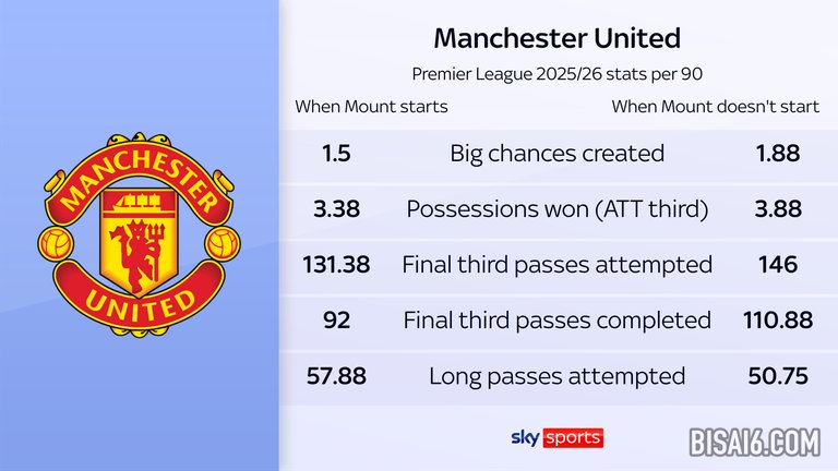 对于很多人来说,芒特已经成为阿莫林希望他的曼联队如何踢球的焦点。当他在球队时,他们显然会取得更好的成绩——当他首发时,红魔在英超联赛中只输过一次,而当他不首发时,红魔输了三场。但数字表明,这并不一定等于更好的表现。