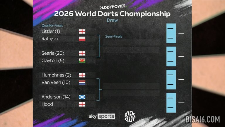 世界飞镖锦标赛将于元旦回归四分之一决赛,乔尼·克莱顿 (Jonny Clayton) 首场对阵瑞恩·塞尔 (Ryan Searle),瑞安·塞尔 (Ryan Searle) 是本次锦标赛中唯一没有丢一盘的选手,随后加里·安德森 (Gary Anderson) 迎战贾斯汀·胡德 (Justin Hood)。