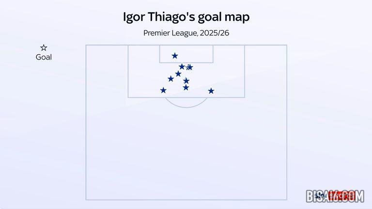 伊戈尔·蒂亚戈周日对阵埃弗顿的帽子戏法使他本赛季英超联赛进球数达到 14 个。他是得分榜上唯一接近埃尔林·哈兰德的球员。桑德兰将在 Gtech 社区体育场阻止他。