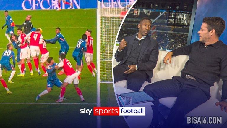 杰米·雷德克纳普和吉米·弗洛伊德·哈塞尔巴因克讨论了在卡拉宝杯半决赛中阿森纳对阵切尔西的首场比赛中,安托万·塞梅尼奥对阵纽卡斯尔的进球被判无效后,维克托·贾克雷斯是否应该被判越位。