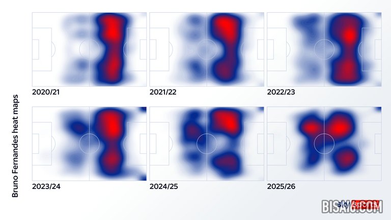 费尔南德斯的热图显示,过去两个赛季他本方半场的活动有所增加,这说明了他在阿莫林的带领下角色发生了怎样的变化。值得称赞的是,这位31岁的球员尽管被要求打得更深,并被挤进了一个不适合他的体系,但他仍然在进攻三区发挥着同样的影响力。