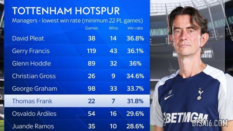 在执教过22场或以上英超联赛的18位热刺主帅中,只有胡安德·拉莫斯和奥西·阿迪莱斯的胜率低于弗兰克(31.8%)。