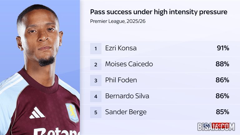 他在控球方面的可靠性是他的众多优势之一,即使在充满挑战的情况下也是如此。在本赛季的英超联赛中,孔萨在高强度压力下完成了492次传球中的448次,这让他的准确率达到了91%,比任何其他球员都高。