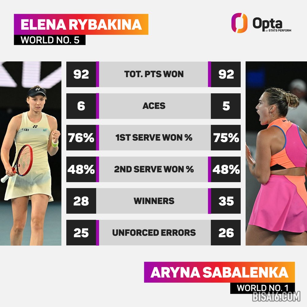 四届大满贯冠军萨巴伦卡在过去 48 场硬地大满贯比赛中取得了 46 场胜利,找到了自己的最佳状态,并以更加积极的态度开始了第二盘,但雷巴基娜挽救了三个破发点,将比分追至 1-1。
