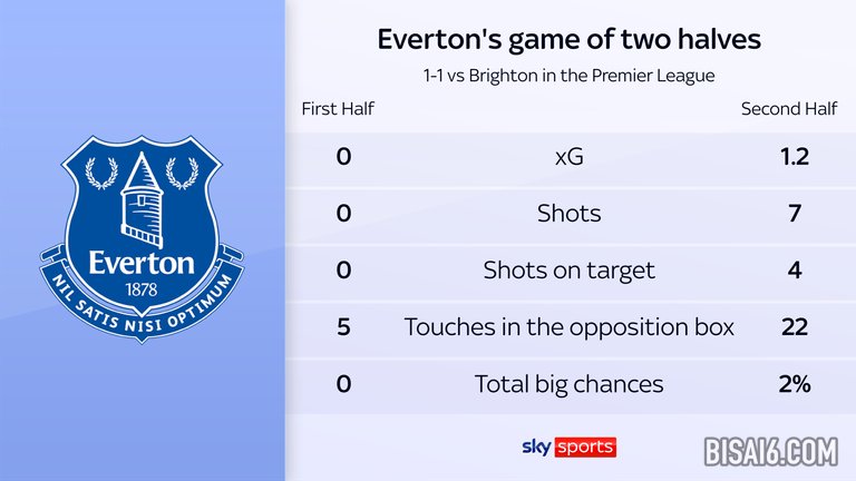 然后,就有机会创造。这是埃弗顿本赛季第三次在开场 45 分钟内没有射门。他们的预期目标为零,并且在对方禁区内只有四次触球。