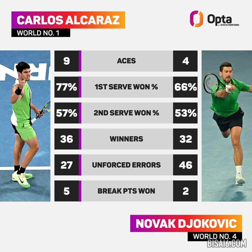 两分后,阿尔卡拉斯破发并在比赛中站稳脚跟,而德约科维奇的统计数据却朝着错误的方向发展。